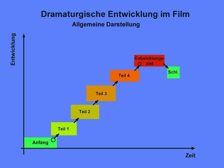 | * Der Anfang ist die Schilderung der Eingangssituation * Die Komponenten Teil 1 bis Teil n sind Bestandteile einer Entwicklung, die alle aufeinander aufbauen, und zu einem Entwicklungsziel führen * Die Komponenten Teil 1 bis Teil n beinhalten jeweils z.B. eine Handlungsepisode, die eine Geschichte ständig in Richtung auf den Höhepunkt so vorantreibt, dass der Zuschauer keine Zeit und keine Lust hat, gedanklich abzuwandern. * Die Pfeile in der Darstellung symbolisieren den Zusammenhang von Handlung und Text zwischen den einzelnen Teilen. Entfernt man einen dieser Teile, dann ist die Handlung, die Geschichte unvollständig. * Am Höhepunkt der Entwicklung ist das Entwicklungsziel erreicht * Der Schluss ist nur noch ein kurzer Ausklang |