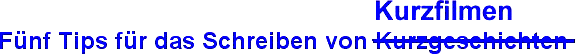 * Filme von weniger als 30 Minuten werden als Kurzfilme bezeichnet. * Auf Kurzfilme ist vorteilhaft anwendbar, was für das Erstellen von Kurzgeschichten gilt und sich dort bewährt hat. * Was hier folgt, sind Tips von Lektoren und Rezensenten, die von den Kurzgeschichten gewisse Qualitäten erwarten, wenn sie sie gut finden sollen: